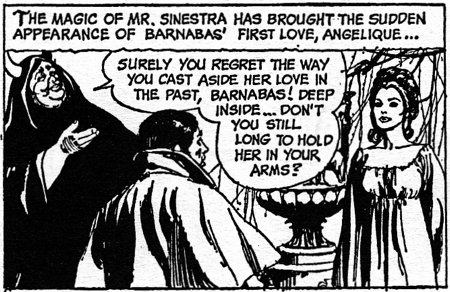 It starts with the return of “Barnabas’ first love, Angelique”. Understandably, the comic strip has untangled the show’s complex soap opera storylines, distilling things down to the minimum viable product so that readers who’ve never seen the show can understand what’s going on in the strip.