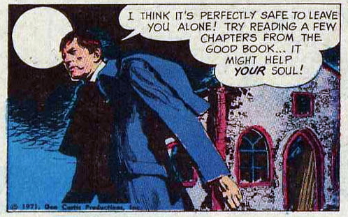 We’re spending a couple weeks reading the 1971 Dark Shadows comic strip, because it seemed like a good idea at the time, although by now it’s turned into a grim look at the End of All Things, and what lies beyond the portal of April Third. The newspaper strip — which outlasted the parent TV show by forty-nine weeks — is trying to grind the show’s narrative into powder, grabbing handfuls of history and scattering them to the winds. It’s possible that I’m overthinking this.