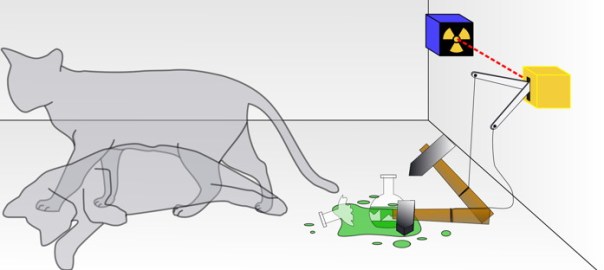 Now, according to quantum mechanics, the atomic decay in the radioactive substance is in both states simultaneously — both decayed and not — until it’s observed, at which point it resolves into one state or the other. And if the cat’s life is determined by the unresolved atomic decay, then the cat is both alive and dead at the same time — until you open the box and look inside, which causes the wave function to collapse into either “alive cat” or “dead cat”. And then you feed the cat, or bury it, as appropriate.