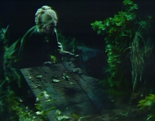 And here’s Angelique at Shipwreck Point, where there seems to be a trap door built into the world. I’m not sure how you’d go about creating a hatch like this, even if you had a shovel and a lawyer. On Lost, they make a big deal about the hatch; just the fact that it exists is enough of a mystery to take them through the whole first season. On Dark Shadows, this is a throwaway detail. And it turns out that when you go through that hatch, there’s a hidden cave down there, which means that somebody around here constructed a secret storm cellar.