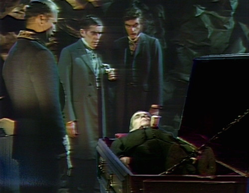 In 1969 Dark Shadows is enjoying its biggest run of top ratings ever, and Barnabas, mumbling and incoherent, marks his return to the TV stage by (apparently) exposing himself — as no longer the threatening and forceful figure that once made him so compelling as to define the series as a whole as a “vampire soap”. He is lying flat on his back, all the “bite” taken out of him, at the mercy of his captors. In 1967 when you see Barnabas lying on his back and vulnerable, it would only be for a moment — when Maggie Evans tries to spike him with a metal rod he sits bolt upright with fangs bared; when Jason McGuire opens the coffin looking for jewels, Barnabas reaches up to strangle him. Even when Willie is looking down at Barnabas to report to him on the day’s events, and Barnabas has not yet risen from his coffin and is looking up at Willie as they talk, Barnabas can still extend his arm straight up to grab him by the throat, just as a reminder as to who controls the situation, not to mention the very course of the show itself.