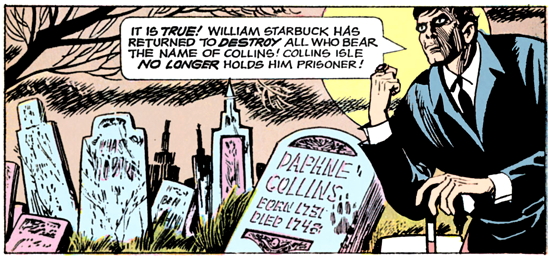 “William Starbuck has returned to DESTROY all who bear the name of Collins!” Barnabas muses furiously, clenching his fist. “Collins Isle no longer holds him prisoner!”