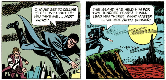 Anyway, the idea is to lure Starbuck back to Collins Isle, which is still right over there, within running distance from downtown Collinsport. “The island has held him for two hundred years!” Barnabas explains. “I will lead him there! What matter if we are both doomed?”