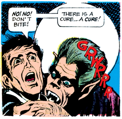 They just kind of thrash around for a couple pages, and finally Barnabas yells I WILL NOT SUFFER THE FATE OF LIVING DEATH AGAIN! and he punches the werewolf right in the kisser. SOK!