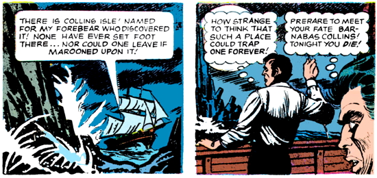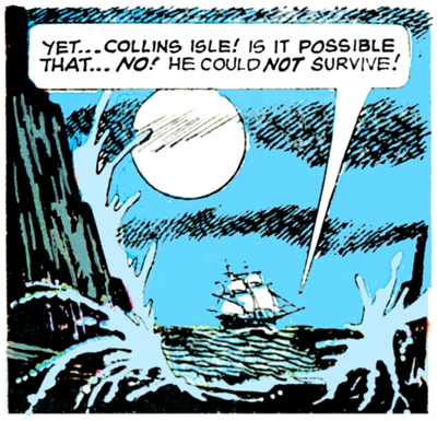 So now we finally introduce the Curse of Collins Isle, as promised in the title. Barnabas is sailing to Europe, apparently solo, and on his way out to sea, he passes a lonely crag.