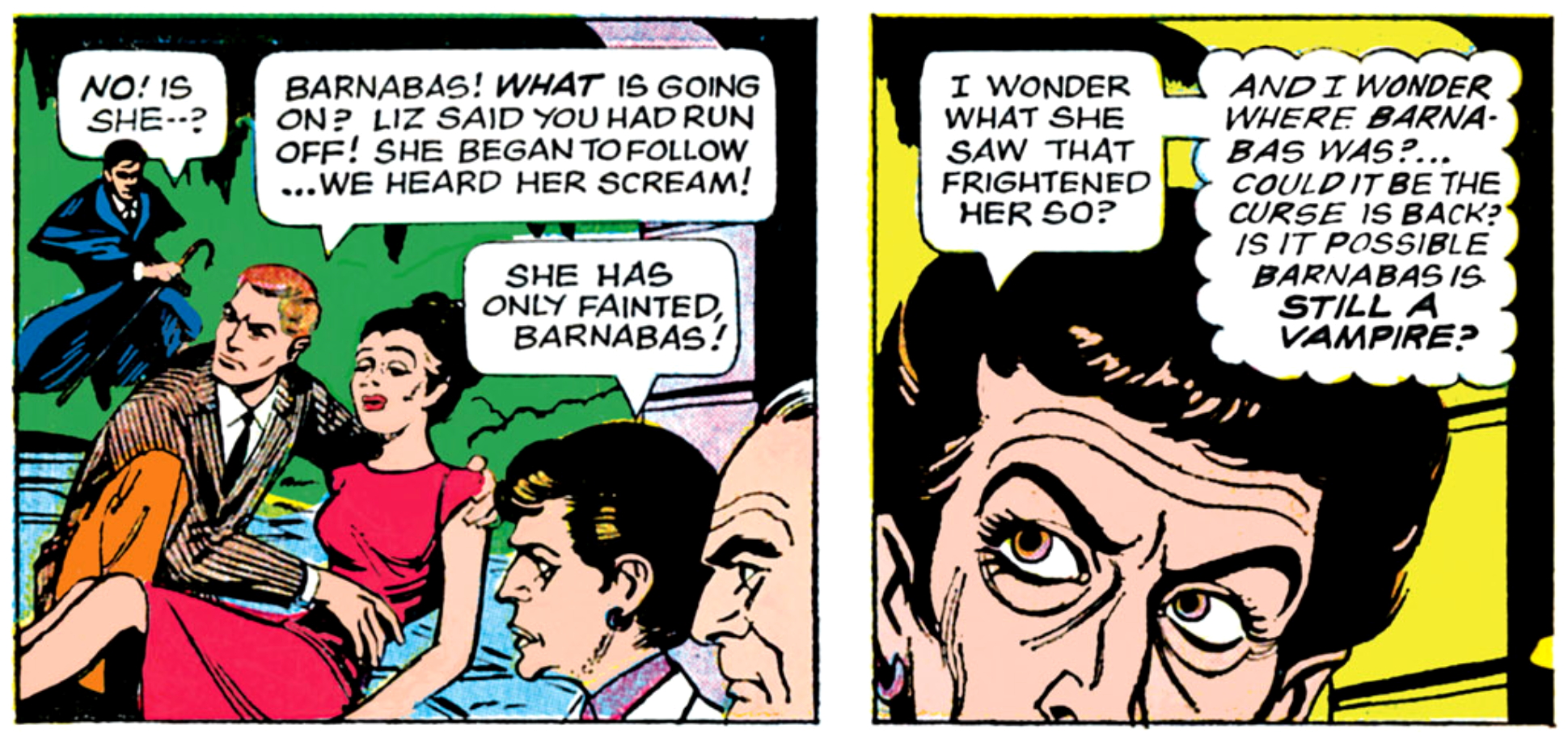 Still, it’s nice that Barnabas isn’t the monster anymore. The last time we checked in with the comic books, he was a non-stop murder machine, constantly plotting against the innocent strangers who happened to wonder if there was something odd about him. But comic book Barnabas has matured slightly, and he’s now pretty much in line with how he acts in the series, except comic book Barnabas hits people with shovels.