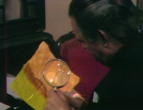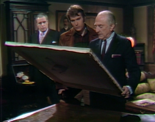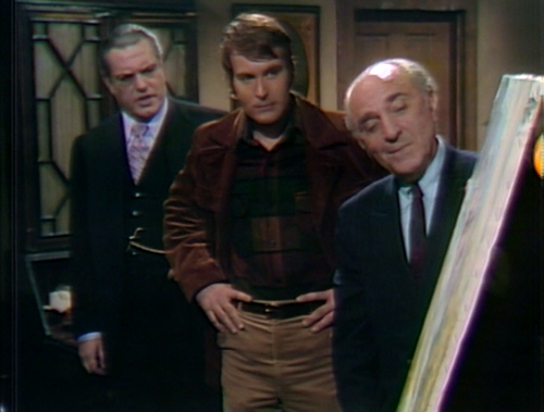 We see Stokes’ house today, which is usually made up of bits from other sets. The “Smith Brothers” portrait of a man with a large mustache is on the wall. I think the big round mirror is in a different place than it was back in the days when Stokes used to entertain Adam. And there’s a yellow chair at the desk that I don’t think we’ve seen before — yellow appears to be the fashionable color for December 1969; we’re seeing a lot of yellow these days.