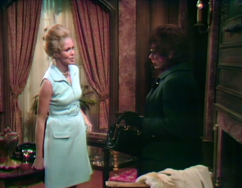 1. Those “chalice” lamps in the corners of Sky Rumson’s drawing room are a taller version of the ones in David’s room at Collinwood. But in terms of set design, look at those doors on the left, how they are shaped with curves at the top, and the windows, the fireplace, the width of the room — all these specifications are the same as for the east wing parlour at Collinwood (which we’ll be seeing lots of soon):