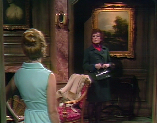 Mr. Best leaves Amanda alone in the Stopping-Off Place, and she walks toward the desk. The camera pulls back a little too far, and we see a brief glimpse of a crew member passing by on the left of the screen.
