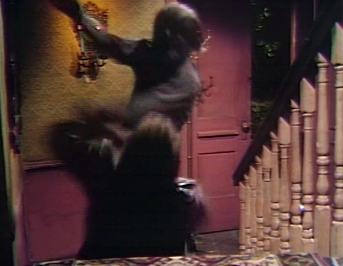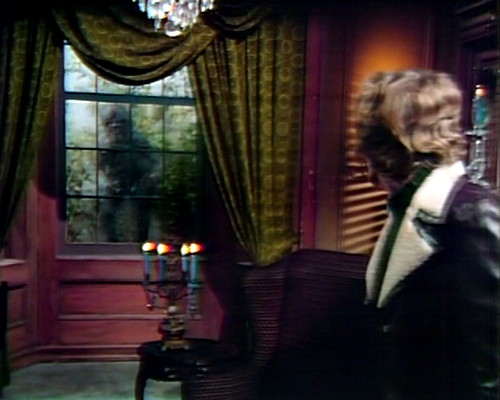 Ker-rashing through the window and exploding into the living room, here’s Jeb’s nightmare in living flesh and claw and fang. Jeb tries to shove the wolf away into a nearby chair, but the animal leaps back up and vaults over a stray end table which was obviously placed there for this specific moment. They’ve taken most of the furniture that they care about out of the room so it won’t get damaged, but there’s still lit candles all over the set because nobody really cared about basic workplace safety in 1970.