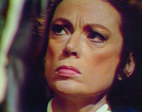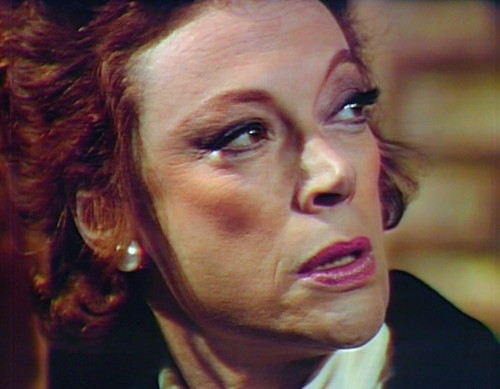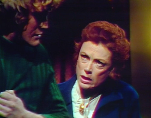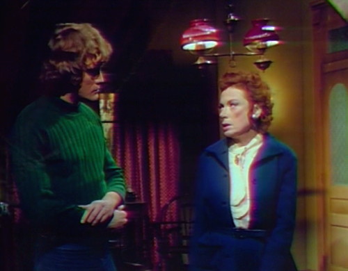 There is a truly epic blooper in this episode, one of the all-time greats. In the Collinwood drawing room, Quentin sidles over to the wall, where there’s a decorative display of two crossed swords. Suddenly, he grabs one of the swords, takes it off the wall, and points it at Sky’s throat. At this point, the other sword falls off the wall and crashes to the floor, taking a lamp with it. You just get a second to see the sword wobbling above the lamp, and then the camera moves away, and you just hear the unholy SMASH! as the lamp hits the floor. They don’t make ’em like that anymore.