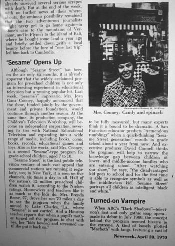 We’re going to leave the show and go play outside today, because Dark Shadows always makes the most sense when you’re not watching it. Instead of today’s episode, we’re going to look at this week’s issue of Newsweek — dated April 20, 1970 — which features a final head-to-head cage match between Dark Shadows and its good twin, Sesame Street, as an influence on America’s youth.