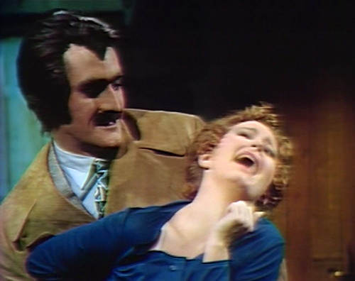 8. OMG. PT is brutal. Chris Pennock has killed Dark Shadows. And all the makeup and hair people must be in Tarrytown as well as the major cast. Arghhhh. Chris probably had to put that nose on himself and sometimes I swear I see his blond hair sticking out the back of his wig. Bruno seems to get his false eyelashes on ok by himself though. Maybe he has had a lot of practice at that….