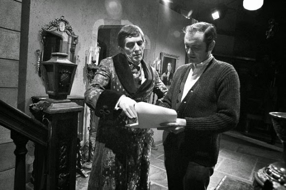 1. The original portrait doesn’t resemble Jonathan Frid at all. The neck is all off, completely different, thin, elongated — because it was done while they were still casting for Barnabas, and producer Robert Costello sat in for it. Frid’s face was added in later once the casting decision was made. In the following image, Costello is shown on the right: