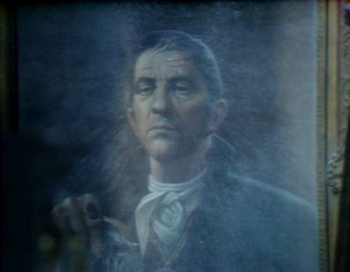 There was speculation in a previous post that the portrait of Barnabas used here in PT is different from the “original” — but this is the original, with the non-Frid thinner, elongated neck, etc. In the movie they only needed the portrait for the one scene when Barnabas shows up at Collinwood to introduce himself as having just come over from England. Rather than incur the expense of commissioning a new portrait they would have just shuttled the one they had from the movie set, which is what it appears they did.