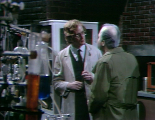 Following the de-yaegification, Cyrus bustles around his lab for a while, like he usually does, and then Yaeger’s girlfriend comes over to complain about something. She’s spotted by the guy from the chemistry company, and then the lawyer comes over, and they talk about the bank account, and Cyrus’ will.