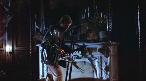 I first saw this in the movies, and remember a scene where Jeff tests out the crossbow, shooting it at a wooden chair. This scene does not show up in the released versions for home viewings.