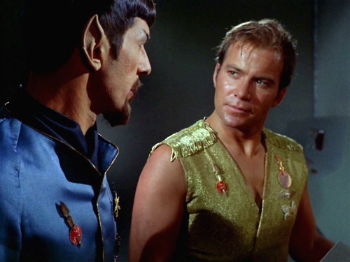 Always bugged me that the Alternate Halkans were just the same as the weenies in ‘our’ universe, and why Alternate Kirk would have troubled to beam down to discuss anything instead of just wiping them out and taking their dilithium. That, and why Mr. Kyle looked just the same…he needed a different hair helmet, and maybe an eye patch – along with a pirate accent (“Arrr, Mister Spock, not me agoniser! “).