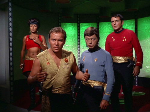 So when Kirk, Uhura, Scotty and McCoy manage to materialize on the landing pad, they step into a worst-case scenario they never saw coming. They’re in the Mirror Universe now, which is exactly like ours except people have made different choices, mostly in the areas of grooming, decor and human resources.