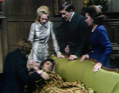 12. Yikes! This is one of the most cockamamie episodes yet. What is even going on here? I do have to say that I am appalled at the state of medicine in Collinsport. Doctors rush over (from another set) to do practically NOTHING. They do the obligatory pulse-taking, by grabbing a wrist and glancing at their watch for a second (Julia does pretend pulse taking a lot). Then, there’s the slapdash stethoscope dabbing at someone’s chest and the pronouncement that “he’s got moments to live.” Of course, those “moments” translate into enough hours for Maggie to pack, hightail it to LaGuardia, hop on a flight to Collinsport !nternational Airport and grab an Uber to Collinwood. During those hours, folks just seem to wander off to other rooms to have pointless conversations leaving Quentin alone in the drawing room on the brink of death. On top of all that, Dr. Cyrus is called away to the hospital “on an emergency.” Isn’t someone lying on a velvet divan on the brink of death an emergency? And why in God’s name during all those hours did no one think of taking the poor guy to THE HOSPITAL, where he might get some actual treatment?? The lesson here, my friends, is DO NOT GET SICK IN COLLINSPORT, ever. You will regret it.