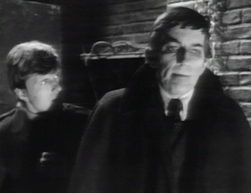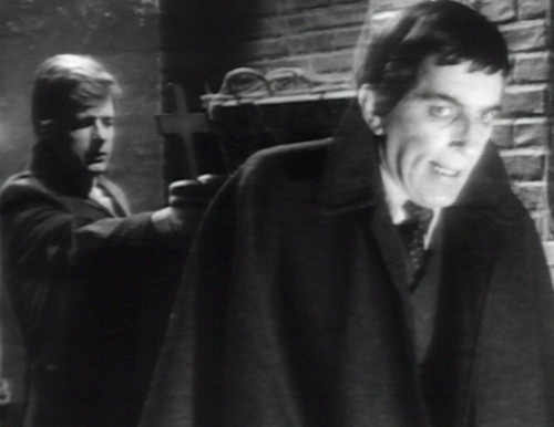 Will gets the cross, and just for fun, he holds it facing Barnabas, who instinctively cowers. “Put it away!” Barnabas growls, and when Will hesitates, we get a little burst of spell-casting music. Grasping his temples, Will drops the cross, and Barnabas triumphs.