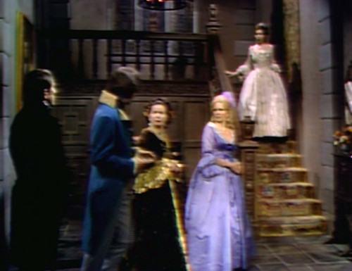 There’s a grand costume ball, represented here by five people, and Maggie’s been tricked into wearing the same outfit that Angelique wore last year. Quentin is furious, smashing a glass and running out of the house, presumably heading for some parallel Collinsport bar that’s willing to serve people dressed as Lieutenant Forbes.