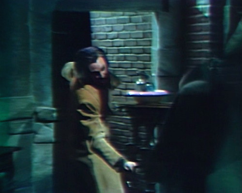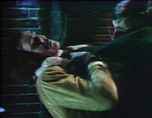 Barnabas strangles Yeager. Maggie comes in a screams very loud. They cut. (They were smart to fade out the music right before the cut.)