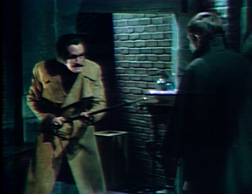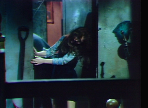 Maggie gets up and stumbles through the door to the basement cell, and we can see past the edge of the set to what I think is the Collinwood foyer, and the corner of Barnabas’ portrait. (See the screenshot below.) When she moves again, you can also see a folding chair.