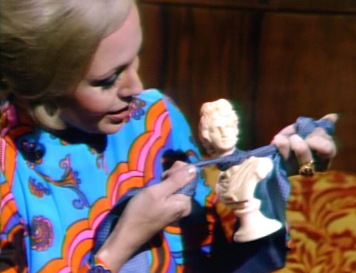 It’s Angelique, of course, it’s always Angelique these days; she’s the only self-actualized character on the show. She’s got one of Bruno’s terrible ascots, and now she’s tied it around an object that for some reason everybody is going to spend the entire week calling a voodoo doll. They actually had a little clay voodoo doll prop a couple weeks ago, but maybe they’ve lost it, because now they’re using this bust-statuette thing instead, except they keep saying it’s a voodoo doll. Good Lord, says a random character who picks it up and looks at it, this is a doll, which was recently used for the purposes of voodoo. I have no idea who they’re trying to kid.