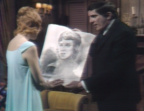Barnabas decides to jog Roxanne’s memory by showing her a charcoal sketch of her that he found in the secret room of the Collins mausoleum last week. And when he goes to pick it up, she just keeps staring straight ahead, not even reacting to the fact that the person she’s supposed to be interacting with has moved to another part of the room.