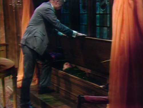 Meanwhile, the Dark Shadows writers had no plan at all, besides getting half the cast members out of the door so they could go make House of Dark Shadows. When they set up the re-enactment of the seance in episode 990, it was Elizabeth and Roger’s last episode before they left for Tarrytown. Carolyn and Will had already left, the day before. There wasn’t any time for people to hang around and establish motives; they had to go put on scuba gear so they could film the movie’s funeral scene.