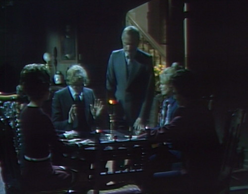 Meanwhile, the Dark Shadows writers had no plan at all, besides getting half the cast members out of the door so they could go make House of Dark Shadows. When they set up the re-enactment of the seance in episode 990, it was Elizabeth and Roger’s last episode before they left for Tarrytown. Carolyn and Will had already left, the day before. There wasn’t any time for people to hang around and establish motives; they had to go put on scuba gear so they could film the movie’s funeral scene.