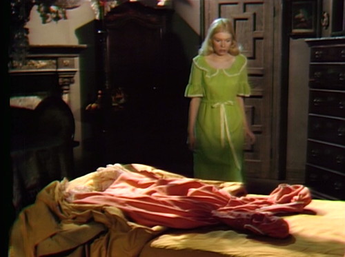 9. You can pick on Hallie as much as you like. I was off to college without a TV when these episodes first aired so my initial exposure to Hallie was during my recent reviewing. My first reaction was Huh? Where did they get her? And WHY? (Why, David? Why?) I loved Denise Nickerson–she was totally believable to me as a traumatized orphan. This girl, not so much. She really should be a little more of a hormonal, moody teen-ager. Heaven knows I was a master whinger in my day, but I didn’t go about like Nan Bobbsey. And as for that green garb: I think it’s a summer robe, but why does everyone run about Collinwood in their jammies? It’s a formal drawing room people, put some clothes on!