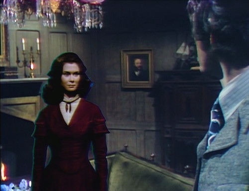 The problem, obviously, is that she’s silent, because they think they’re doing The Turn of the Screw again, and the ghosts in The Turn of the Screw don’t talk. Every other ghost on Dark Shadows talks a mile a minute — try having a heart-to-heart sometime with Julianka, or playing a quick round of catch with little Sarah — but T of the S spooks don’t say a word. It’s called sonic branding.