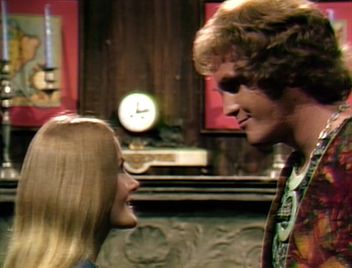 But history repeats, and so does Dark Shadows these days, with alarming regularity. We cut away from Liz and Carolyn to another three scenes of David and Hallie having the same argument in the playroom, the playroom and David’s room, in that order, and then it’s back downstairs for another news bulletin from T-Square and the Yod on the KLNS morning show.