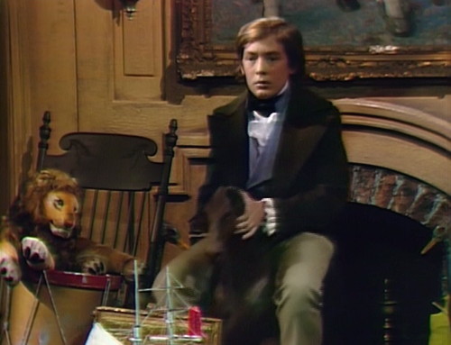And now here she is, entering the magical 1840 playroom, and she sees David sitting on the rocking horse, wearing exactly the clothes that she was talking about.