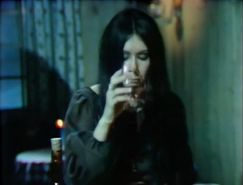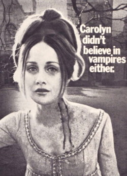 In the film, Jonathan Frid plays a vampire, Kathryn Leigh Scott plays a girl, and Nancy Barrett plays a girl vampire, so she wins. You see a lot of Carolyn-the-vampire images in the promotional materials, because that’s the traditional early-70s horror movie draw — a pretty girl in a flimsy nightgown, with blood all over her face. This was the period after they invented red paint and before they invented slasher movies, so sometimes the girls had to go and get bloody some other way.