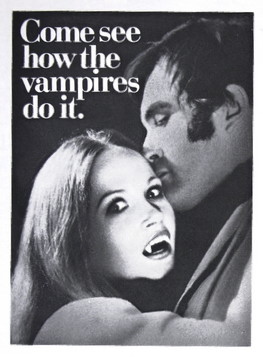 Meanwhile, MGM sent promotional material to the theaters that could have been used for basically any vampire movie from around 1954 to 1979 — plastic fangs, glow-in-the-dark stickers, and “fainting pills” which were actually red-hot candy. They suggested that theater owners put an old wooden casket in the lobby, and invite people to peek inside, and apparently some of them actually did.
