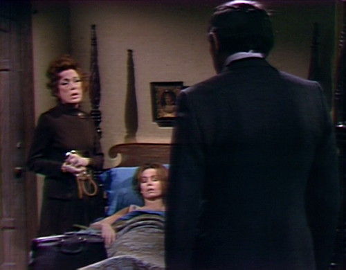 much of a difference. They made a song and dance about whether Julia should wait at the house, but Barnabas walks in a minute later anyway, dragging Maggie by the shoulders. “She’s very weak, we must get her to her room!” he says, because sure, why let her stay down on the first floor, where she might recover? Might as well haul her upstairs. Characters are just