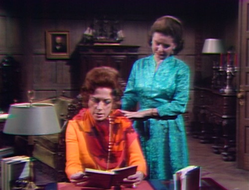 And now that almost everyone is possessed, there isn’t much you can do except have the possessed characters get in each other’s way. Intent on pleasing Gerard, Carolyn runs off to one of Collinwood’s infinite number of dusty old storage rooms so she can rummage around in a trunk of other people’s stuff. Liz follows, and asks Carolyn what the hell, and Carolyn, elbows-deep in the recycling bin, tells her to get lost.