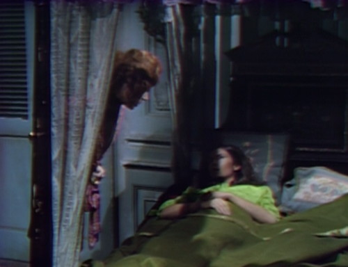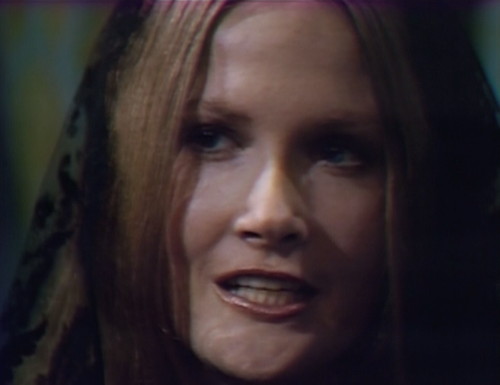And here’s Ophelia, descending a staircase. Barnabas sprints over to Collinwood for reasons unknown, and runs smack into Carolyn, who may be Leticia and is dressed for mourning. This is one of Gerard’s pet marionettes, a Carolyn changeling who’s even more crazy than the officially crazy 1995 version.