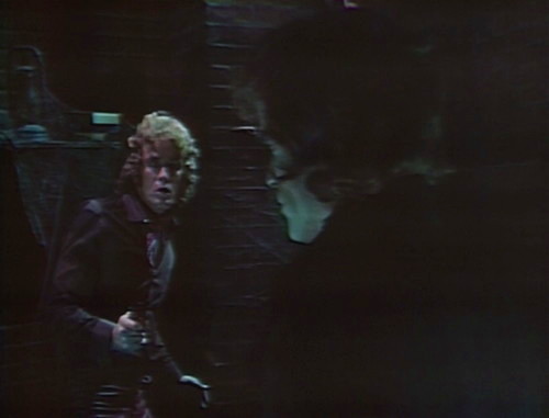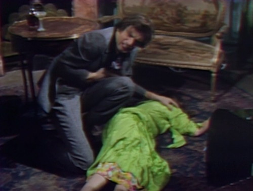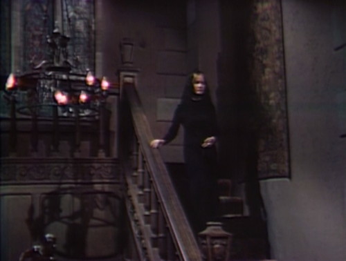 And here’s Ophelia, descending a staircase. Barnabas sprints over to Collinwood for reasons unknown, and runs smack into Carolyn, who may be Leticia and is dressed for mourning. This is one of Gerard’s pet marionettes, a Carolyn changeling who’s even more crazy than the officially crazy 1995 version.