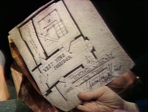 But her research did uncover one important clue — a blueprint for a Proposed Stairway Into Time, which apparently works, because that’s how she got to this century: a wormhole opened in the continuum right in front of her, and she hopped on board. We haven’t seen Quentin working on this yet, and we don’t know if he ever used it to get anywhen, but he drew up that blueprint this year and it’s already October.