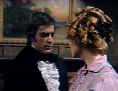 1. I will say it again: Donna Wandrey has the loveliest skin I’ve ever seen and bless the directors for those tight close-ups. The actors were all so young and even the beauteous Kathryn Leigh Scott and Laura Parker had their blemish-y days. And don’t talk to me about Hallie’s skin–a mess. But not Donna. In terms of mise-en-scene (pardon my French), I believe the director is scrutinizing her exquisite face through Trask’s eyes–hence getting closer and closer on them to emphasize his demonic fixation on her. Let’s not forget that the spurned Trask will play a decisive role in the somewhat laughable but affecting last two episodes of the 1840 arc. As for the Desmond close-ups, no f—ing clue.