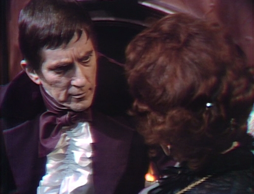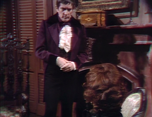 That scene where Julia has her back to the camera for a couple minutes while she and Barnabas are sizing things up, that may have been to show off the costume Barnabas has, that whipped cream thing-a-ma-bobby in the middle breast of his suit where his tie would normally be, the way it magnifies the light like he had a whole can of vanilla cake frosting sprayed on.