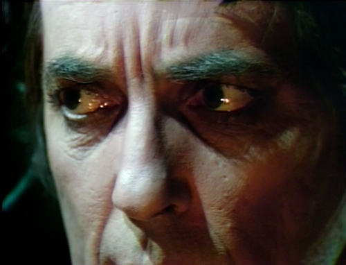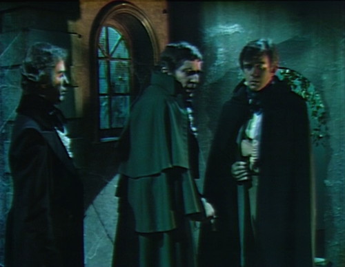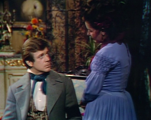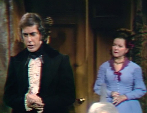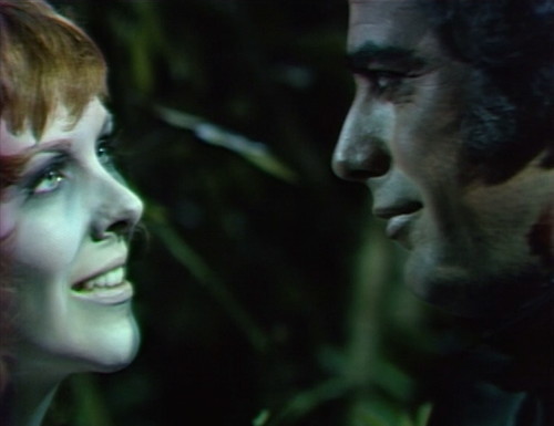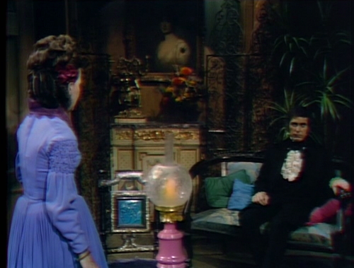 We don’t even see her enter the room. Barnabas is just leaning over Julia, and then he looks up and cries, “Roxanne!” And then we see her, green-faced and unhappy. Then he stands up, and talks to her, and then we see her, walking towards him — but not quite enough to get him in the frame. Then a close-up of him, and a close-up of her, and a really tight close-up of him just showing his eyes and nose, and a looser close-up of her that tightens into her eyes and nose, and then his, and then hers, and then she turns around and walks out the door. They could have filmed them on two completely different sets, or on different days, or not at all.