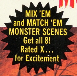 Unfortunately, the marketing department got a little over-enthusiastic, and added this thrilling pitch line to all of the boxes: “Mix ‘Em and Match ‘Em Monster Scenes — Get all 8! Rated X… for Excitement”!