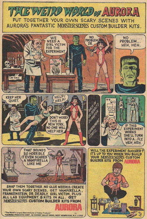 Then they made some more bad choices. James Warren, publisher of Famous Monsters of Filmland, introduced a new comic book in late 1969 called Vampirella, about a busty and nearly-nude vampire vixen created by Famous Monsters editor Forrest J. Ackerman. Warren wanted Aurora to produce a Vampirella model kit, which would be cross-promoted in both magazines.