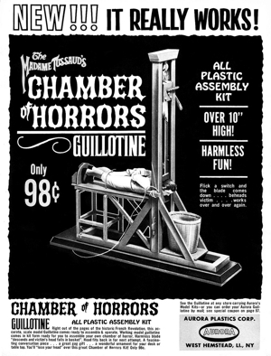 Aurora had dipped their toes into the torture-toy biz back in 1964, when they produced a Madame Tussaud’s Chamber of Horrors Guillotine model that actually worked, and cut off the 1/15 scale prisoner’s plastic head. They had plans for a whole line of these models, including a Rack, a Gallows, an Electric Chair and a Hanging Tree, but they scrapped these plans when parents objected that the Guillotine model kit was gruesome and inappropriate for kids. Still, that was seven years earlier, and in the bright new dawn of the early 70s, it was probably totally fine.