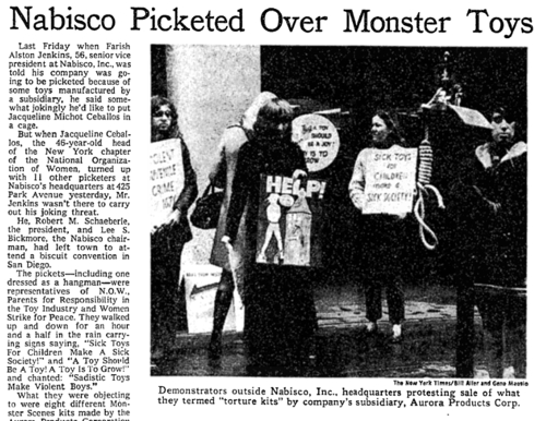 By November 1971, the company was getting picketed by the National Organization of Women, who carried signs that said “Sick Toys for Children Make a Sick Society!” And the picketers didn’t show up at Aurora — they went to the headquarters of Nabisco Inc, the cookie company that had just acquired Aurora in May.